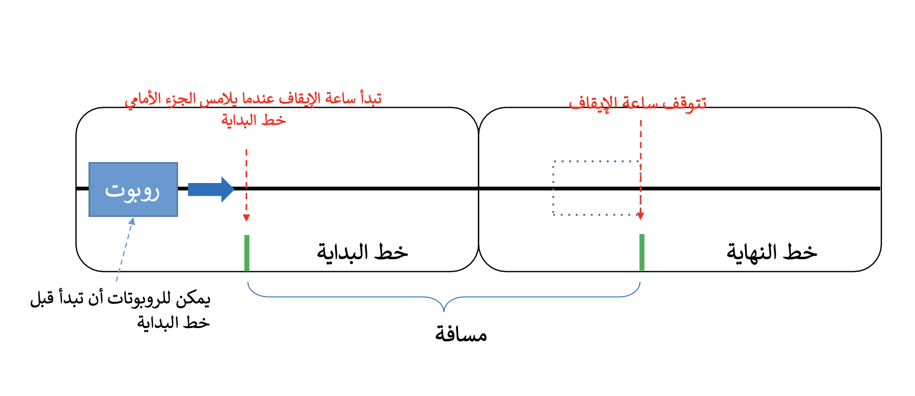 - مُبرمجة لمتابعة مسار العرض الداخلي (الخط الأسود) أثناء اكتشاف روبوت أمامها والتوقف، ثم إعادة التشغيل عندما يختفي.