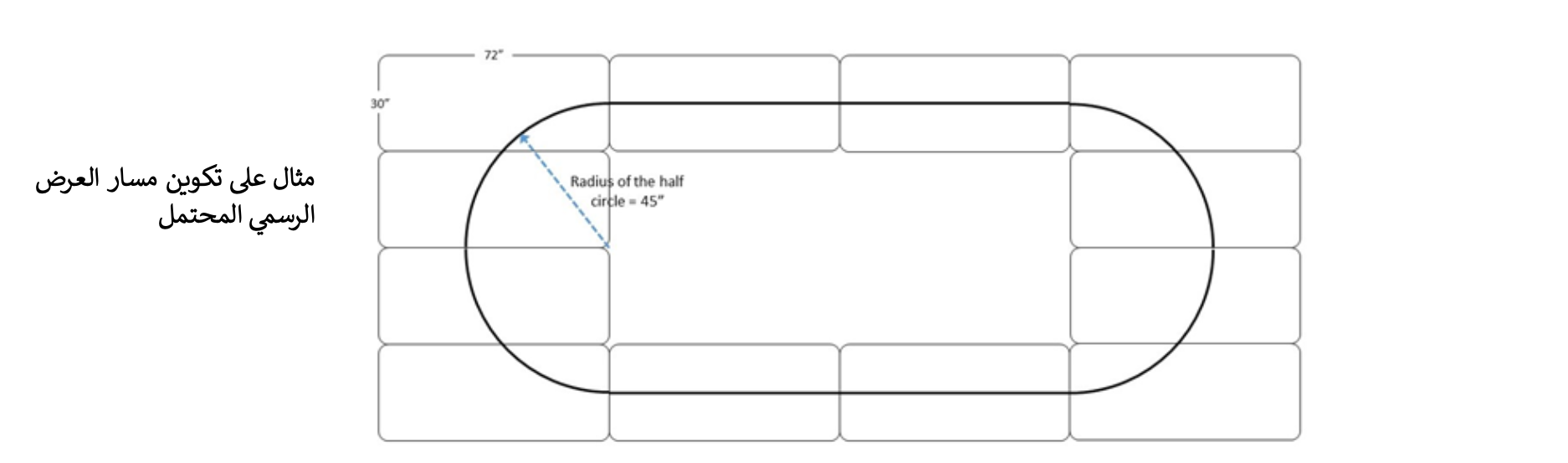 - المسار مصنوع من طاولات بلاستيكية قابلة للطي (30 × 72 بوصة).