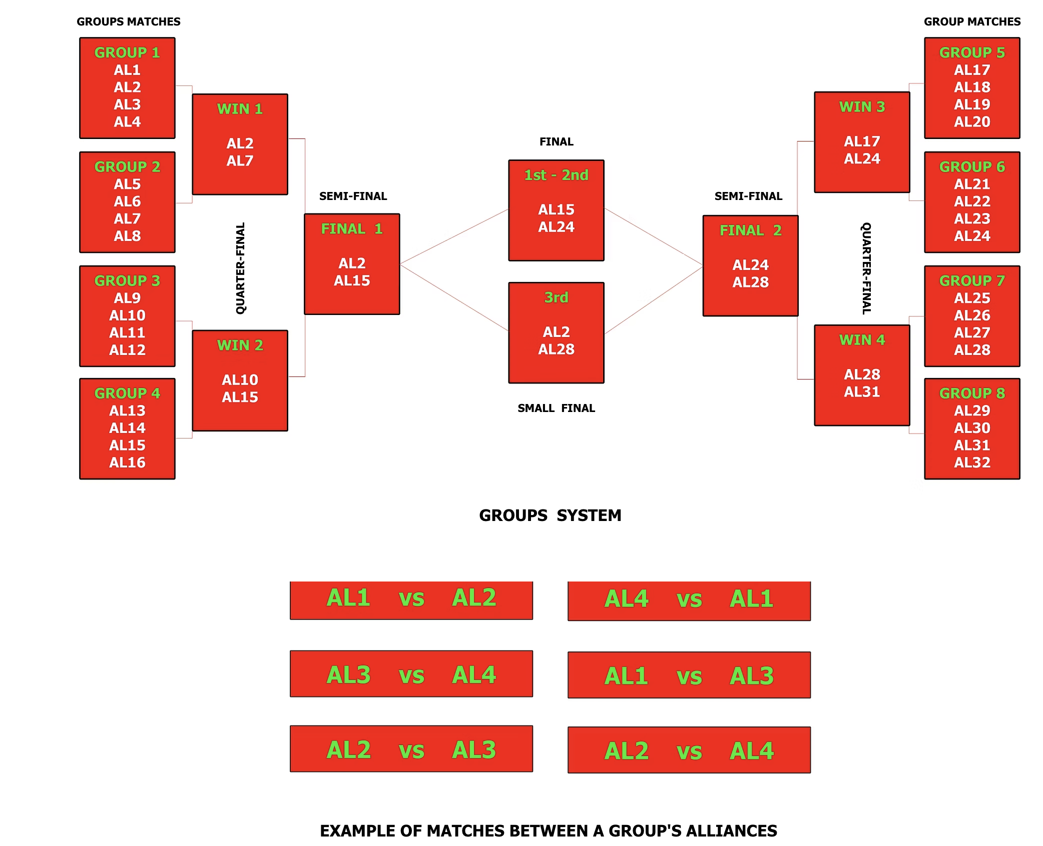 - التحالف الذي يحقق أكبر عدد من النقاط من كل مجموعة يتأهل إلى ربع النهائي.